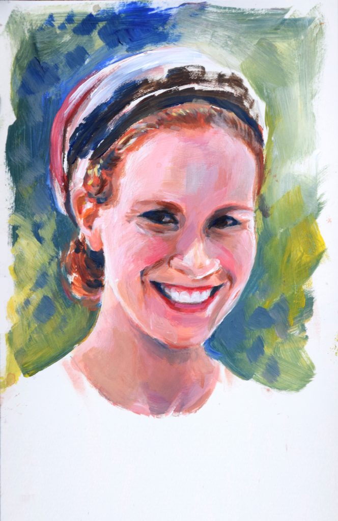 But then, for a change, one of my friends did an actual PAINTING of me! So…. I had to return the favor. Overcame my laziness, got out my paints, and did a small portrait painting of her. It felt great to be working with my acrylics again!